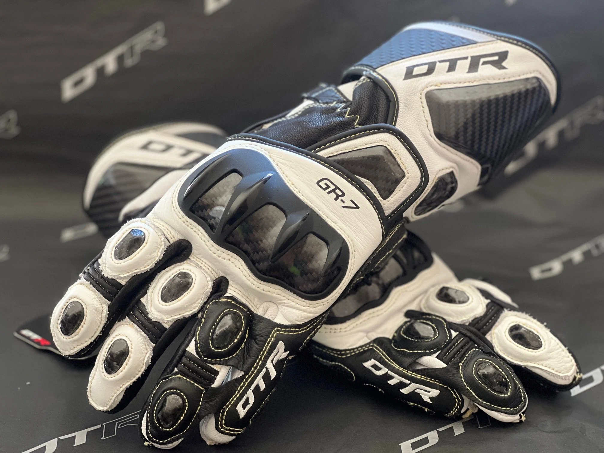 A pair of white and black racing motorcycle gloves with carbon fiber accents, labeled DTR and GR-7, resting on a black surface with DTR branding.